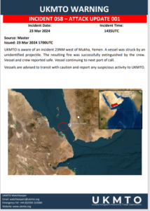 The UKMTO added that Maritime vessel struck by a projectile 23 nautical miles off the coast of Mykhailo, Yemen