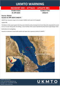 The UKMTO reports that a ship was attacked in the Red Sea, 150 nautical miles west of Hodeidah, Yemen.