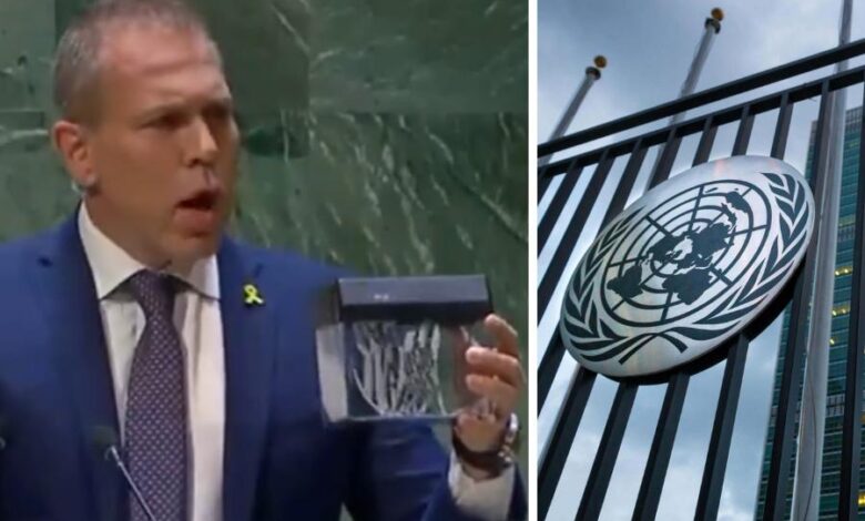 Gilad Erdan was seen using a mini paper shredder on the podium of the UN general assembly on Friday.