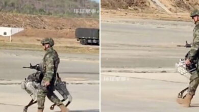A video of a Chinese People’s Liberation Army (PLA) soldier walking with a robot dog equipped with a machine gun…
